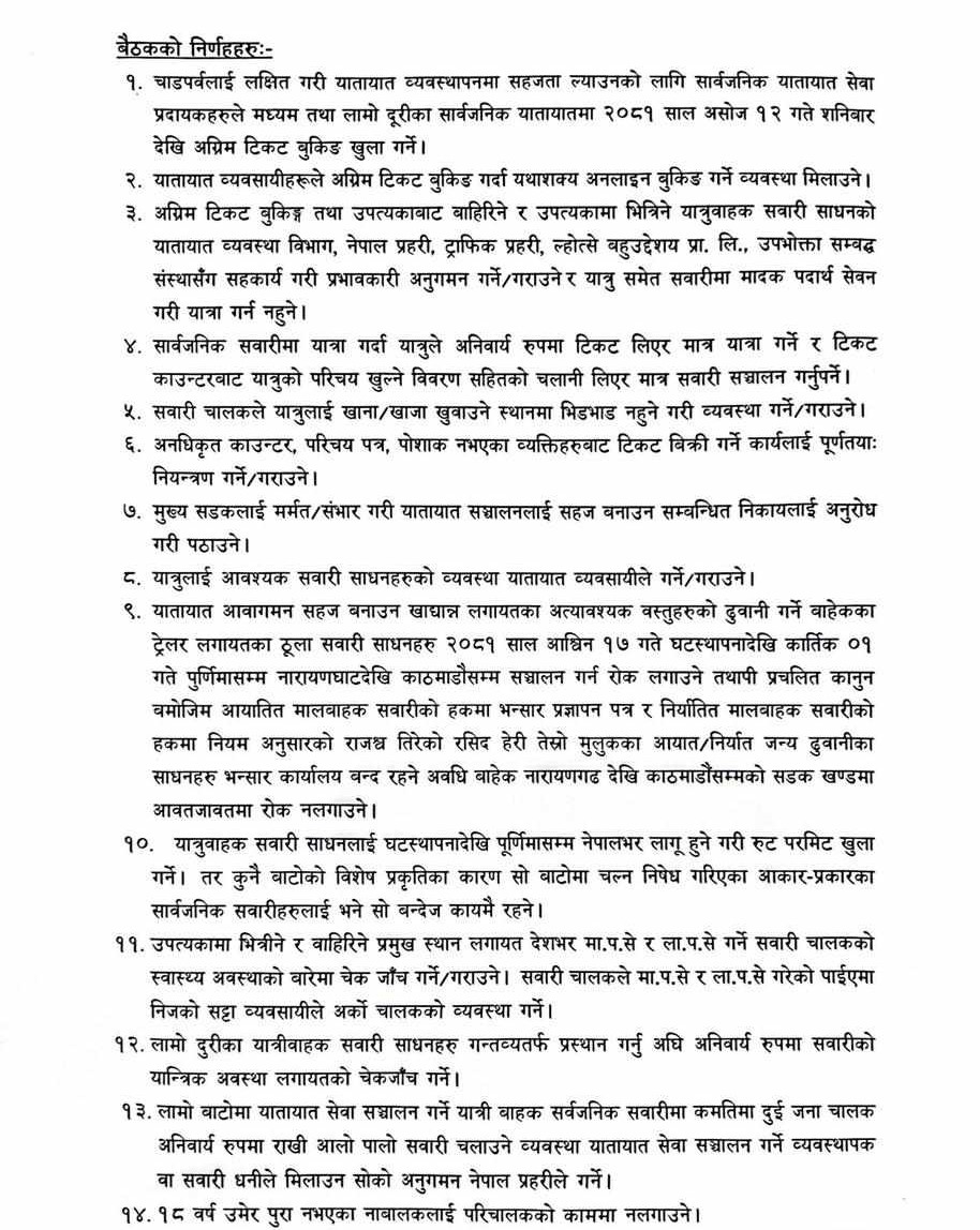 काठमाडौं । दशैंका लागि सार्वजनिक सवारीसाधनको अग्रिम टिकट बुकिङ असोज १२ गतेदेखि खुला हुने भएको छ । भौतिक पूर्वाधार तथा यातायात मन्त्रालयमा मंगलबार यातायात व्यवसायी, ट्राफिक प्रहरीका अधिकारी तथा यातायात क्षेत्र सम्बद्ध निकायका अधिकारीहरुबीचको बैठकले उक्त निर्णय गरेको हो ।