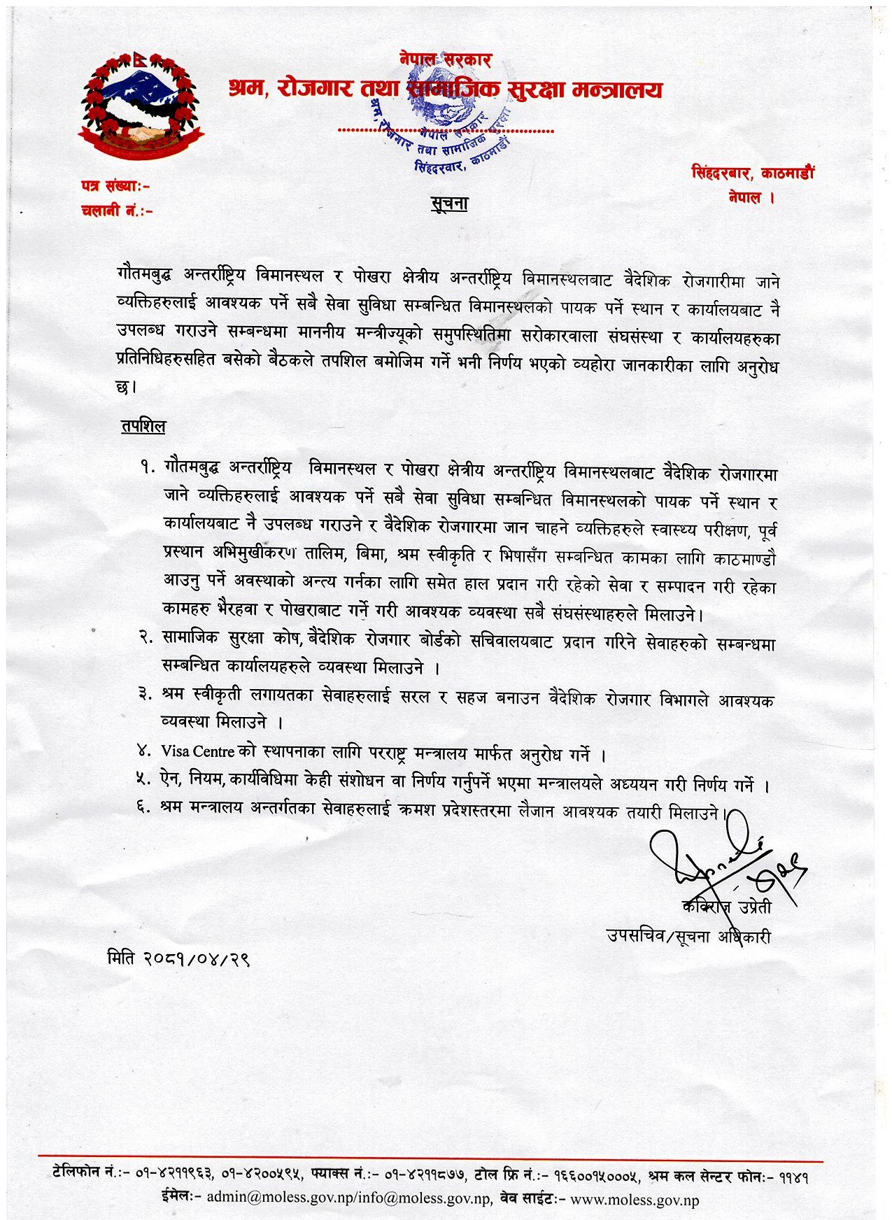 मन्त्रालयका उपसचिव एवं सूचना अधिकारी कविराज उप्रेतीले सूचना जारी गर्दै गौतमबुद्ध अन्तर्राष्ट्रिय विमानस्थल र पोखरा क्षेत्रीय अन्तर्राष्ट्रिय विमानस्थलबाट वैदेशिक रोजगारमा जाने व्यक्तिलाई आवश्यक पर्ने सबै सेवासुविधा सम्बन्धित विमानस्थलको पायक पर्ने स्थान र कार्यालयबाटै उपलब्ध गराइने बताए।
