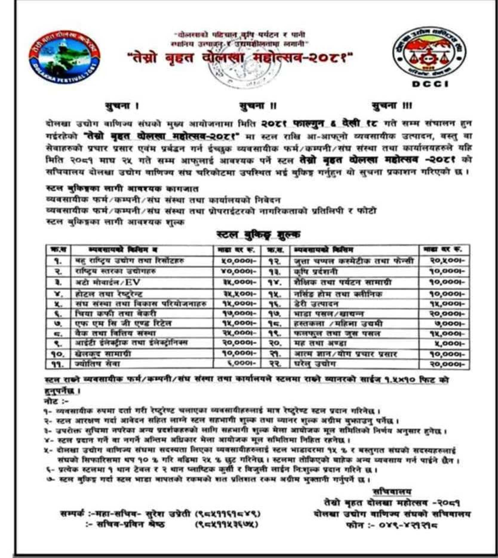 यस्तै जिल्ला समन्वय समितिका प्रमुख बर्जुराम घतानीले मेला महोत्सव गर्दा स्थानीयस्तरमा के कस्ता प्रतिफल प्राप्त भएको यसको पनि समिक्षा गर्न आग्रह गर्नु भयो । यसैगरी भीमेश्वर नगरपालिकाका मेयर ईश्वर नारायण मानन्धरले भीमेश्वर नगरले भौतिक पूर्वाधार निर्माणका काम तिब्रगतिले गरिरहेको बताउँदै नगरवासीको आयअर्जनकालागी पर्यटनको विकासमाध्यान दिनु पर्ने आवश्यकता रहेको बताउनु भएको थियो । समापन समारोह दोलखा उद्योग वाणिज्य संघका अध्यक्ष ईन्द्रबहादुर श्रेष्ठको अध्यक्षतामा सम्पन्न भएको थियो । महोत्सव फागुन ६ गते बाट सुरु भएको थियो ।