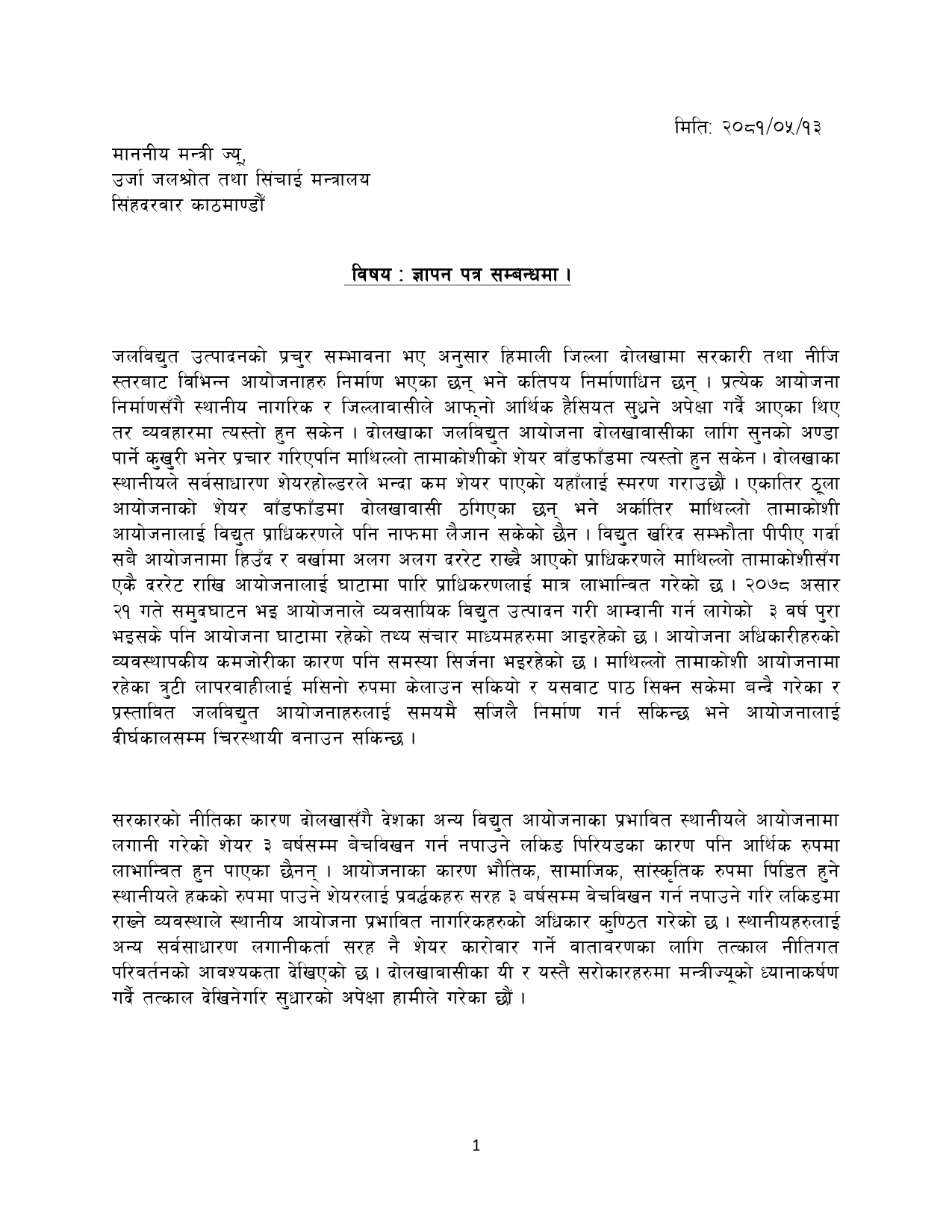 ज्ञापनपत्र लिँदै मन्त्री खड्रकाले वर्तमा सरकार मूलुकमा उर्जाको विकास गरी गरिव र विपन्न वर्गको जीवनस्तर उकास्न लागि परेको बताउनुभयो । स्थानीयलाई साथमा लिएर अगाडि बढ्ने सरकारको नीति रहेको उहाँको भनाई रहेको थियो ।