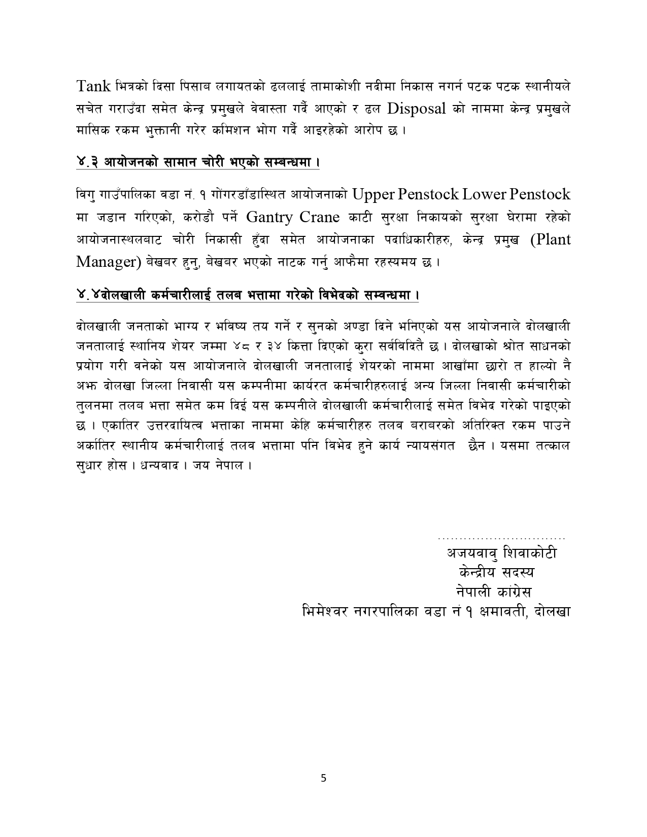 ज्ञापनपत्रमा स्थानीय जनतालाई दिइँदै आएको शेयरको लकिङ पिरियड हटाउनुपर्ने, नेपाल विद्युत् प्राधिकरण र अपर तामाकोशी जलविद्युत् आयोजनाबीच असमान विद्युत् खरिद सम्झौतालाई पुनरावलोकन गर्न माग गरिएको केन्द्रीय सदस्य शिवाकोटीले जानकारी दिनुभयो । यस्तै ज्ञापन पत्रमा आयोजनाको ड्याम साइटमा पानी चुहिने समस्या रहेकाले मर्मत सम्भार गर्नुपर्ने, हिउँदयाममा सम्झौता भएअनुसारको विद्युत् दिन नसक्दा तिरिँदै आएको पेनाल्टीलाई बर्खायाममा पुर्ण क्षमतामा सञ्चालन गरी परिपूर्ति गर्नुपर्ने लगायतका माग गरिएको छ । दोलखाका जनताको भाग्य र भविष्यसँग जोडिएको माथिल्लो तामाकोशी जलविद्युत आयोजनामा सामान चोरी हुँदै गएको भन्दै त्यसको संरक्षण गर्नसमेत माग गरिएको छ ।