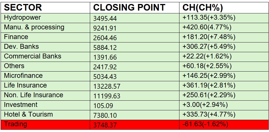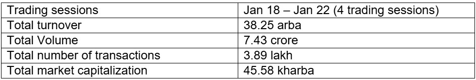The NEPSE index rised from 2,640.13 to 2,714.61, gaining 73.18 points, a growth of 2.77% this week. Weekly turnover stood at 38.25 arba, with 7.43 crore shares traded across 389,187 transactions. The total market capitalization now stands at 45.58 kharba.