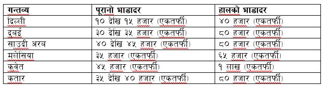त्यस्तै, कतारको एक तर्फी हवाई भाडा नै एक लाख रुपैयाँ पुगेको छ । यसअघि कतारको दुईतर्फको हवाई टिकटको शुल्क ५० हजार रुपैयाँ थियो ।