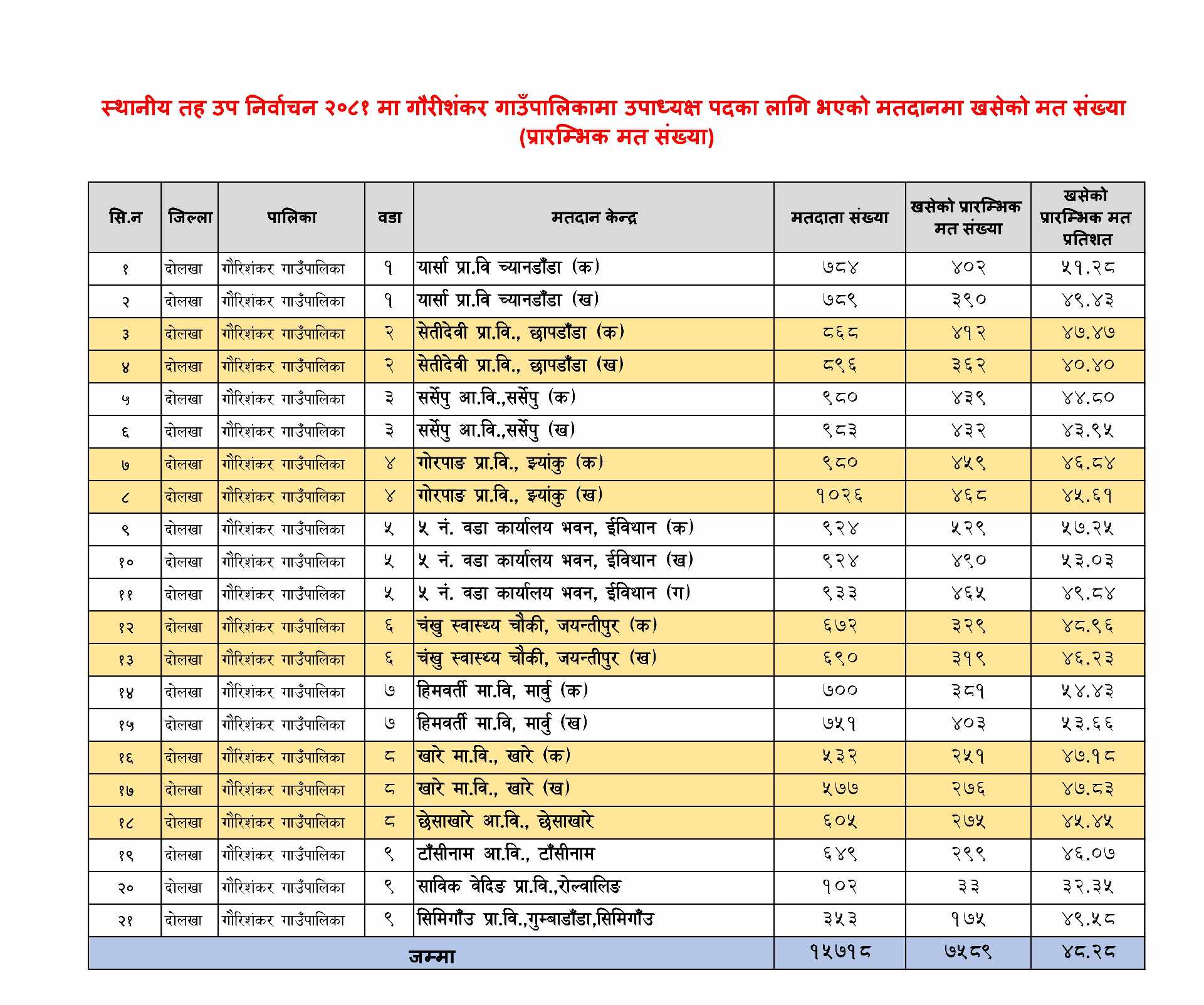 कुल १५ हजार ७१८ मतदाता रहेकोमा ७ हजार ५८९ जनाले मतदान गरेको कार्यालयले जनाएको छ । जुन कुलमतदाता संख्याको ४८ दशमलब २८ प्रतिशत हुनु आउँछ । गौरिशंकर गाउँपालिकामा कुल नौ वटा वडाहरु रहेका छन् ।