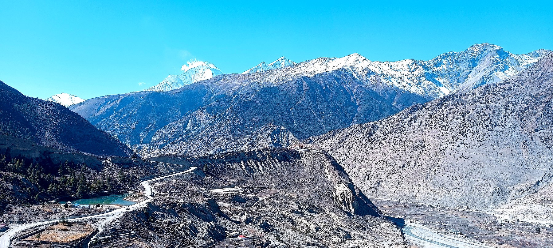 मुस्ताङको चर्चित पर्यटकीयस्थल ढुम्बा तालबाट देखिएको मानापाथी हिमाल, धौलागिरी आइसफल जाने 'ट्रेकिङ रुट' र पृष्ठभूमिमा धौलागिरी हिमाल । तस्बिरः सुशीलबाबु थकाली/रासस