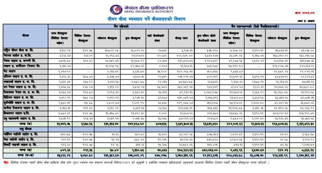 काठमाडौं ।चालु आर्थिक वर्षको चैत मसान्तसम्म जीवन बीमा कम्पनीहरूले कूल १ खर्ब २६ अर्ब १८ करोड १२ लाख २० हजार रुपैयाँ बीमा शुल्क संकलन गरेका छन्। नेपाल बीमा प्राधिकरणका अनुसार सो अवधिमा नेपाल लाइफ इन्स्योरेन्स कम्पनीले सबैभन्दा धेरै ३३ अर्ब १ करोड ७८ लाख रुपैयाँ बीमाशुल्क आर्जन गरेको छ। त्यसपछि नेशनल लाइफ इन्स्योरेन्सले १५ अर्ब ६४ करोड ११ लाख रुपैयाँ, र तेस्रो स्थानमा एलआईसी नेपालले १४ अर्ब ३ करोड ६३ लाख रुपैयाँ बीमाशुल्क आर्जन गरेको तथ्यांकमा उल्लेख छ।