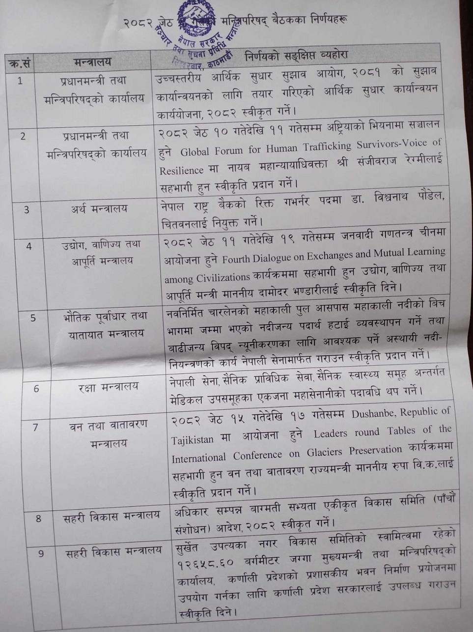 मंगलबार बसेको मन्त्रिपरिषद् बैठकका निर्णयहरू सञ्चार तथा सूचना प्रविधिमन्त्री पृथ्बीसुब्बा गुरुङले बिहीबार पत्रकार सम्मेलन गरी नौ निर्णय सार्वजनिक गरेका छन्।