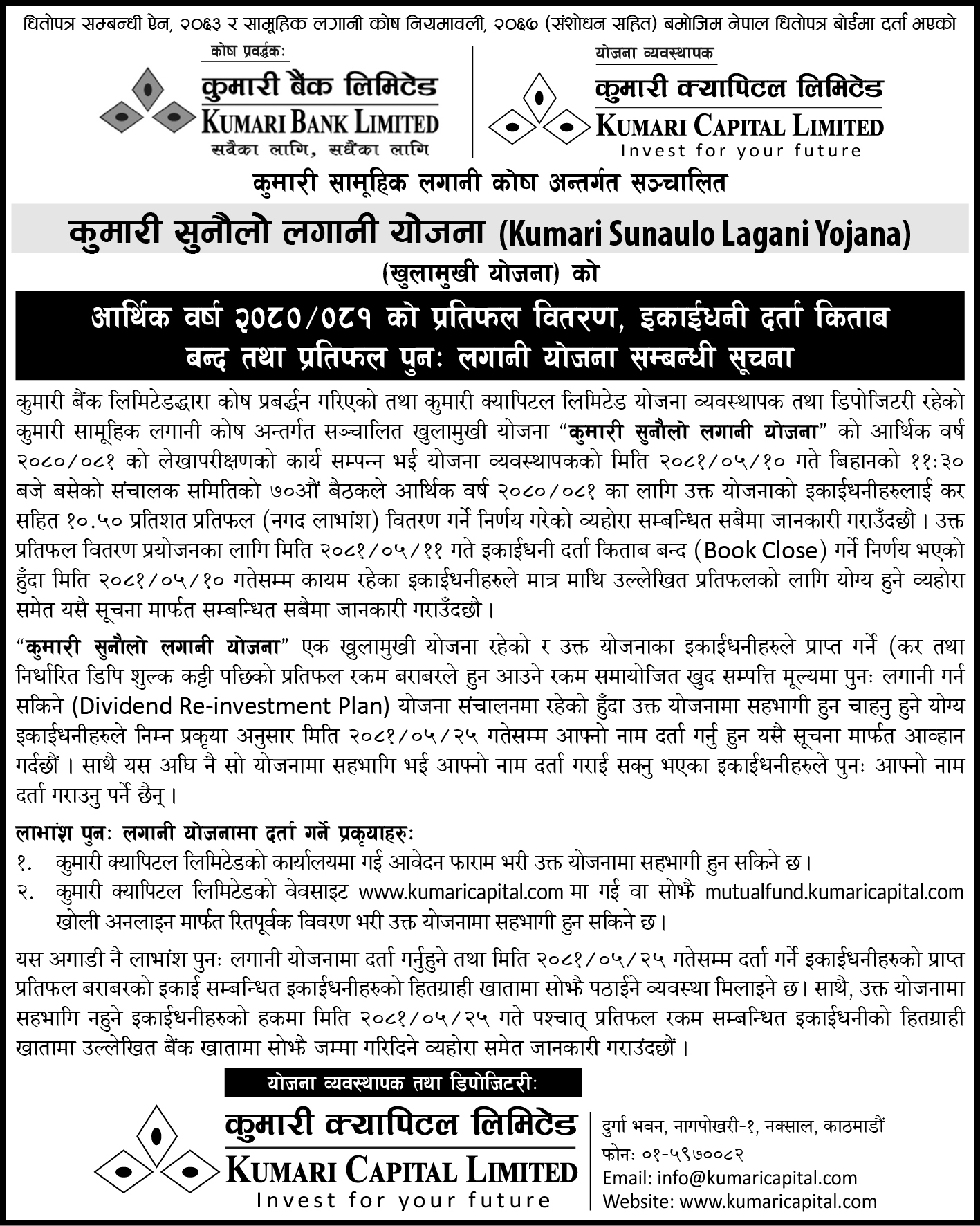 कुमारी सुनौलो लगानी योजना एक खुलामुखी योजना भएकोले इकाईधनीहरुले प्राप्त गर्ने रकम समायोजित खुद सम्पत्ती मूल्यमा पुनः लगानी गर्न सकिनेछ । लाभांश पुनः लगानी योजनामा सहभागि हुन चाहने इकाईधनीहरुले भदौ २५ गतेसम्म आफ्नो नाफा दर्ता गर्नुपर्नेछ ।