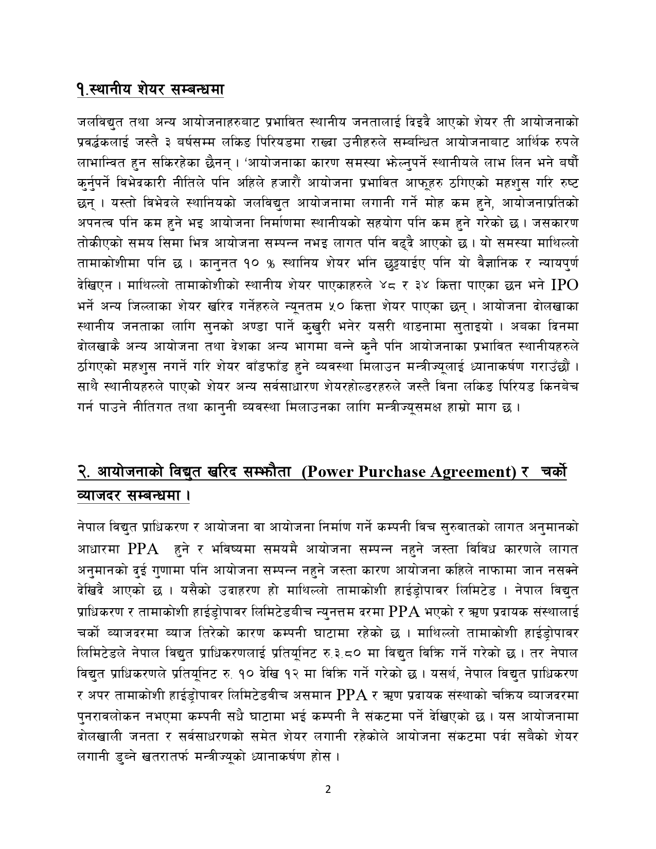 ज्ञापनपत्रमा स्थानीय जनतालाई दिइँदै आएको शेयरको लकिङ पिरियड हटाउनुपर्ने, नेपाल विद्युत् प्राधिकरण र अपर तामाकोशी जलविद्युत् आयोजनाबीच असमान विद्युत् खरिद सम्झौतालाई पुनरावलोकन गर्न माग गरिएको केन्द्रीय सदस्य शिवाकोटीले जानकारी दिनुभयो । यस्तै ज्ञापन पत्रमा आयोजनाको ड्याम साइटमा पानी चुहिने समस्या रहेकाले मर्मत सम्भार गर्नुपर्ने, हिउँदयाममा सम्झौता भएअनुसारको विद्युत् दिन नसक्दा तिरिँदै आएको पेनाल्टीलाई बर्खायाममा पुर्ण क्षमतामा सञ्चालन गरी परिपूर्ति गर्नुपर्ने लगायतका माग गरिएको छ । दोलखाका जनताको भाग्य र भविष्यसँग जोडिएको माथिल्लो तामाकोशी जलविद्युत आयोजनामा सामान चोरी हुँदै गएको भन्दै त्यसको संरक्षण गर्नसमेत माग गरिएको छ ।
