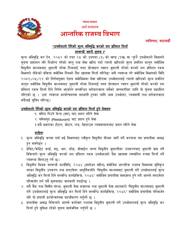 विभागकाअनुसार क्युआर, कोड, मोबाइल बैंकिङ, डेबिट क्रेडिट कार्ड जस्ता विद्युतीय भुक्तानीका उपकरणबाट भुक्तानी गर्ने ग्राहकहरुले १० प्रतिशत भ्याट फिर्ता पाउनेछन। यसका लागि सम्बन्धित भुक्तानी प्रदायकले १० प्रतिशत भ्याट फिर्ता बापतको रकम ग्राहकको खातामा तुरुन्तै फिर्ता हुने व्यवस्था मिलाउनलाई विभागले निर्देशन दिएको छ।