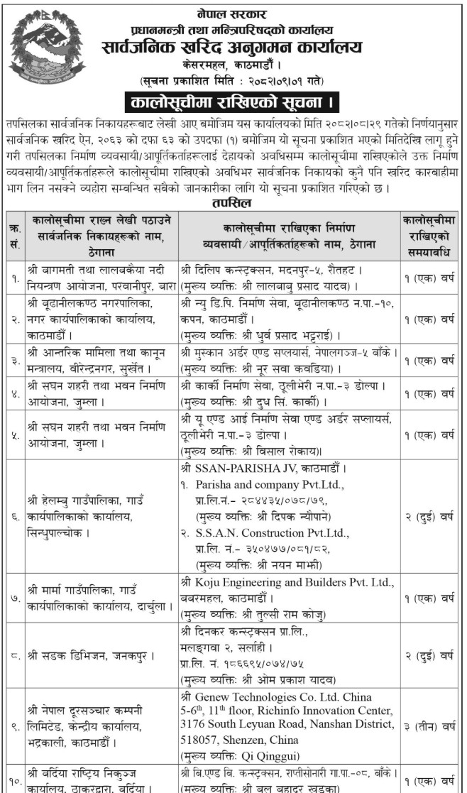 कालोसूचीमा पर्नेमा बागमती तथा लालबकैया नदी नियन्त्रण आयोजना, बुढानीलकण्ठ नगरपालिका, आन्तरिक मामिला तथा कानून मन्त्रालय, शहरी तथा भवन निर्माण आयोजना, गाउँपालिका तथा सडक डिभिजन कार्यालयसँग सम्झौता गरेका निर्माण व्यवसायी तथा आपूर्तिकर्ता कम्पनीहरू रहेका छन्।