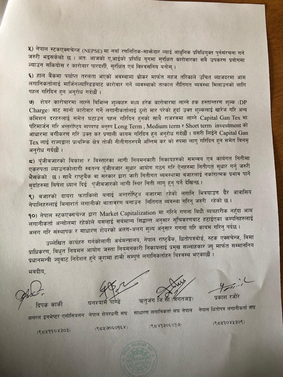 प्रधानमन्त्रीका आर्थिक सल्लाहकार तथा पुवृ अर्थमन्त्री युबराज खतिवडालाई भेटेर सयेर लगानीकर्ताहरुले दश बुँदे सुझाब बुझाएका छन्। शेयर लगानीकर्तासंग सम्बन्धित चारवटा संघका अध्यक्षहरुले खतिवडालाई भेटेर सरकारले पूँजीबजार सुधार्न तत्काल गर्नुपर्ने कामहरुको बिषयमा आग्रह गरेका हुन् ।